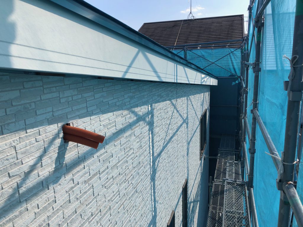 外部はサイディング張り作業が完了し、破風板を取り付けました。