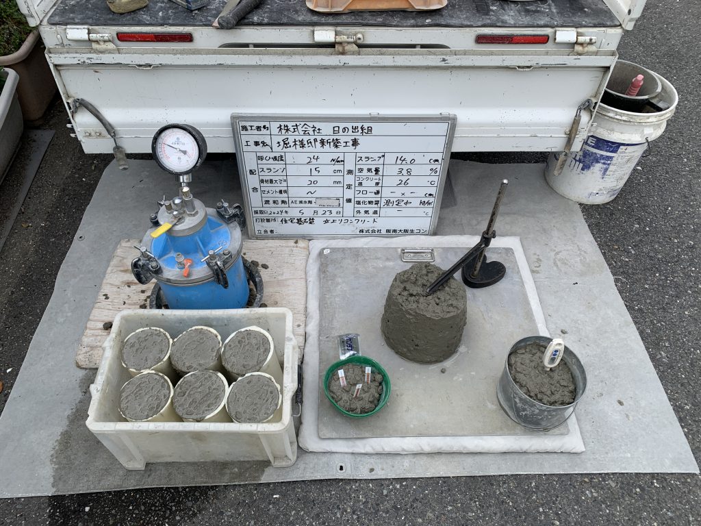 打設前にコンクリートの受け入れ検査として、スランプ試験を行い、流し込むコンクリートの品質確認をした後、打設を行います。