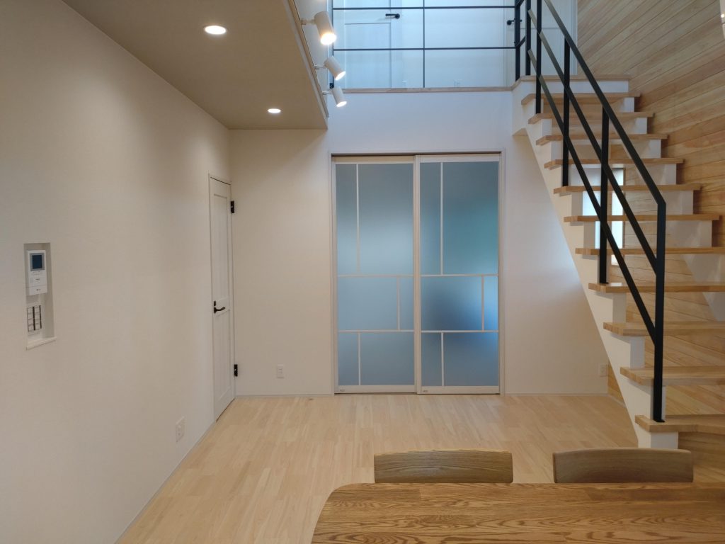 吹き抜け部に階段を設置した事で階段したスペースもリビングの一部として使えるようにした事