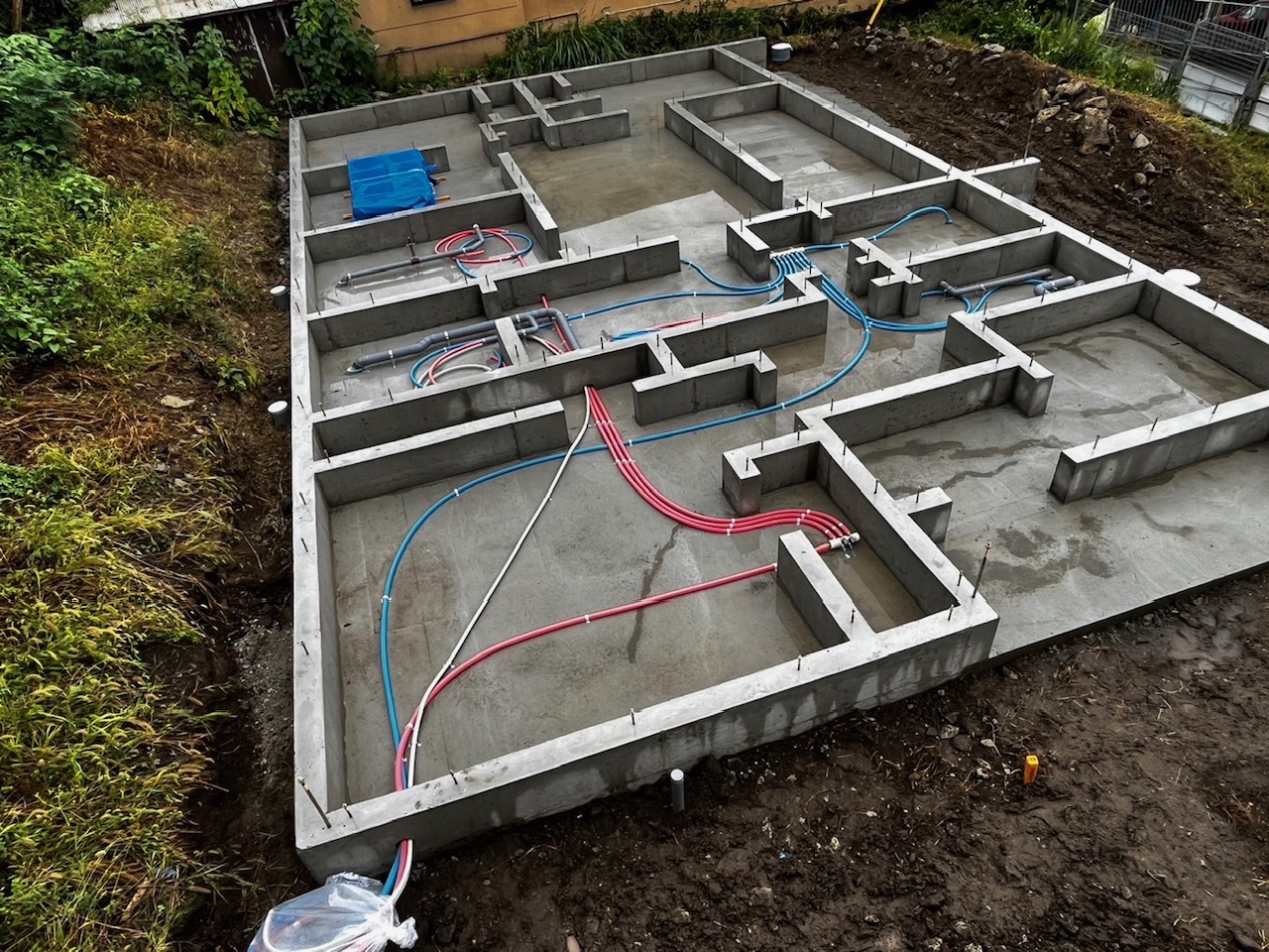 コンクリート打設後の給排水の先行配管作業を行っています。