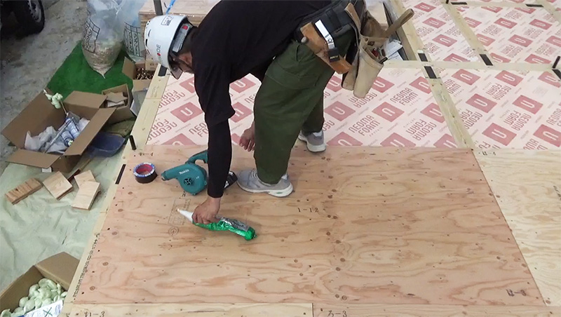 剛床工法は、厚み28mmの構造用合板を直接貼り、床全体を一体化することで地震時に建物が変形しにくくする技術です。通常の床工法に比べて床全体を強固に固定するため、揺れが生じても床が壊れにくく、建物の横方向の変形が抑えられます。また、床のたわみや床なりを抑制する効果もあります。