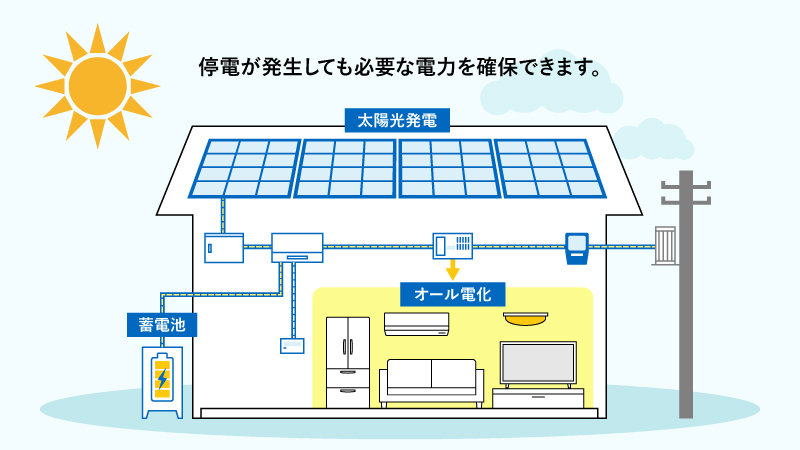 オール電化は停電時の対策にも強みがあります。オール電化の住まいに太陽光発電と蓄電池を備えることで、停電が発生しても必要な電力を確保できます。