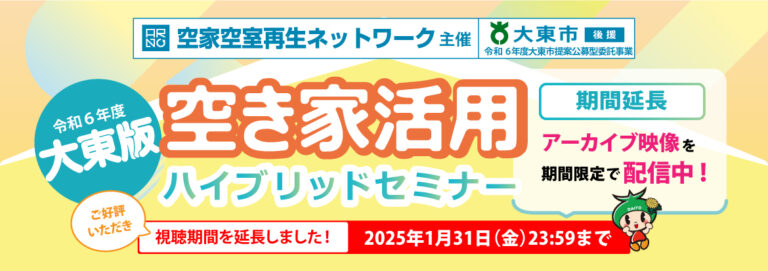 NPO法人 空家空室再生ネットワークにて11月に「令和6年度大東版空き家活用ハイブリッドセミナー」(大東市提案公募型委託事業)を開催いたしました。