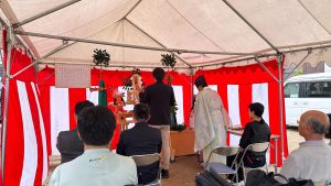 新築工事のスタートに向けて、萱島神社の宮司様をお招きし、地鎮祭を執り行いました。