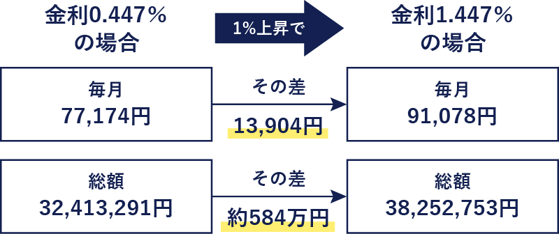 金利0.447%の場合と金利1.447%の場合を比較すると、毎月の返済でも1万円以上、総額だと500万円以上の差に!
