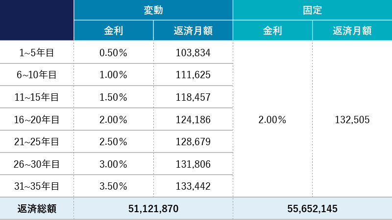 ・変動金利は0.5%で5年ごとに金利が0.5%ずつ上昇