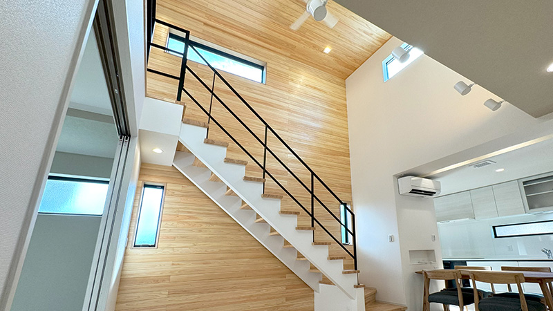 リビングは、吹抜けとオープン階段を採用し、実際より広く感じられる工夫を取り入れています。吹抜け部分にオープン階段を設置することで、視覚的な広がりを持たせることができます。さらに、高所に設置した窓は、採光と換気に効果的です。