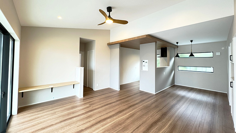 リビングは、平屋ならではの勾配天井を採用し、開放感や広がりを持たせています。