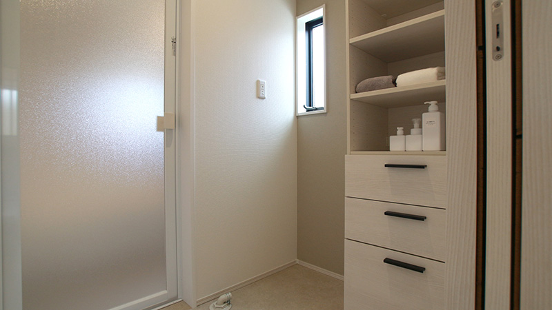 洗濯物を「洗う→干す→たたむ→しまう」という動線がこのエリアで完結できる設計になっているため、効率的になり時短も叶いますよ。急な雨や花粉も気にならない室内干し対応もしています。