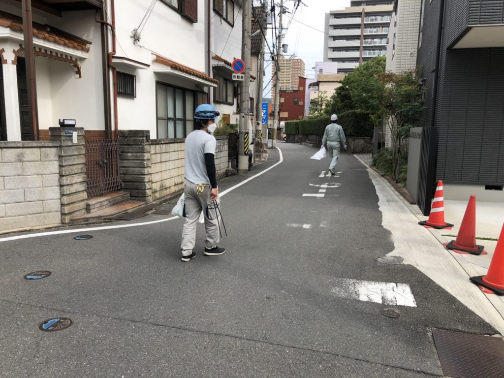 工事中近隣の方には騒音・搬入車両等でご迷惑をかけしていますので、週一回全面道路等の一斉清掃を実施しています。