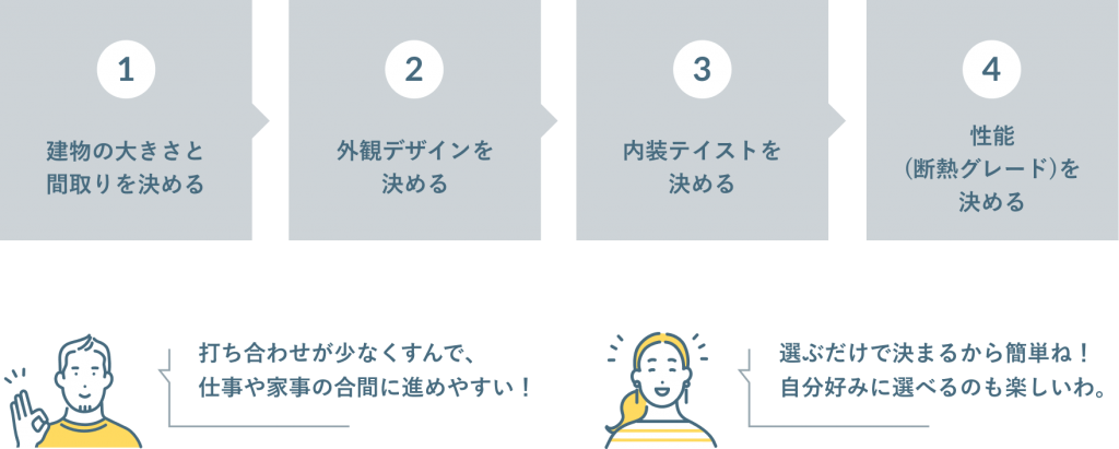お家づくりのステップも簡単4ステップになっており、忙しくて設計士との打ち合わせに時間がさけないという方にも選ばれています。