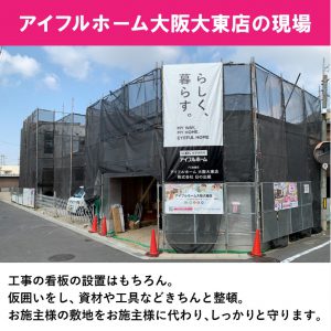 アイフルホーム⼤阪⼤東店では、完成したお家だけでなく⼯事中の現場を⾒て、お家づくりを任せられる会社かどうか、じっくりとご判断いただきたいと思っております。