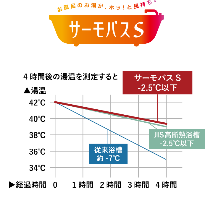 浴槽と専用組フタによるダブル保温構造で、入浴後4時間経っても湯温低下が約2.5℃以下。家族で入浴時間がずれても最後まで温かく、追いだき回数を減らして光熱費の節約にもつながります。