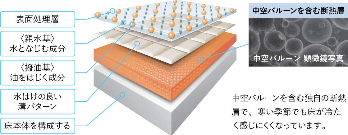 独自の断熱層が足裏から逃げる熱を少なくして、冬場でも足元が冷ヤッとしない快適な浴室空間を実現します。