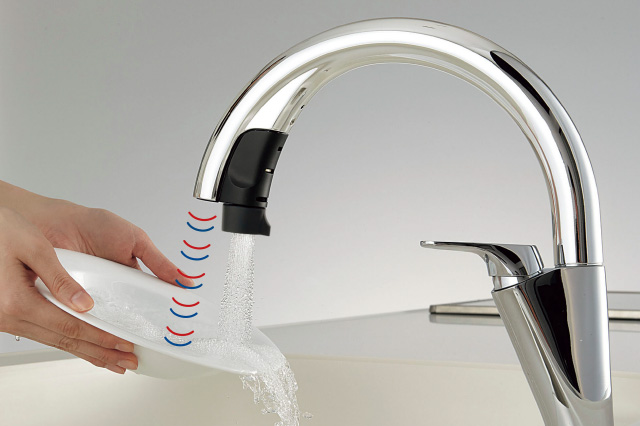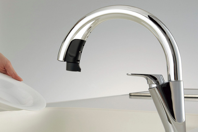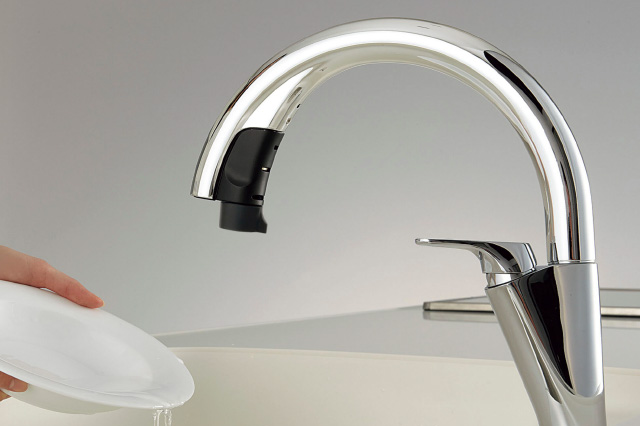 吐水口の下に洗い物を差し入れるとセンサーが感知して、自動的に吐水します。