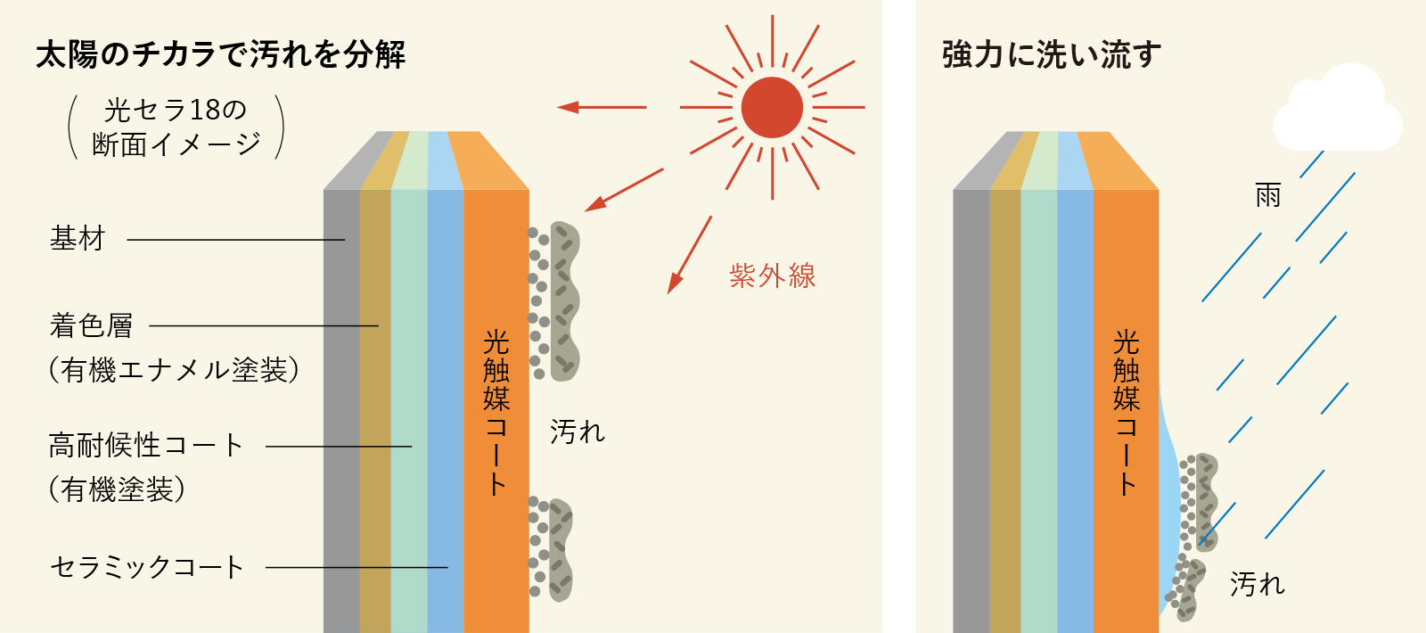 色あせの原因となる紫外線を3層のコーティングで徹底ガード。長年にわたり色褪せ・日焼けを防ぎます。