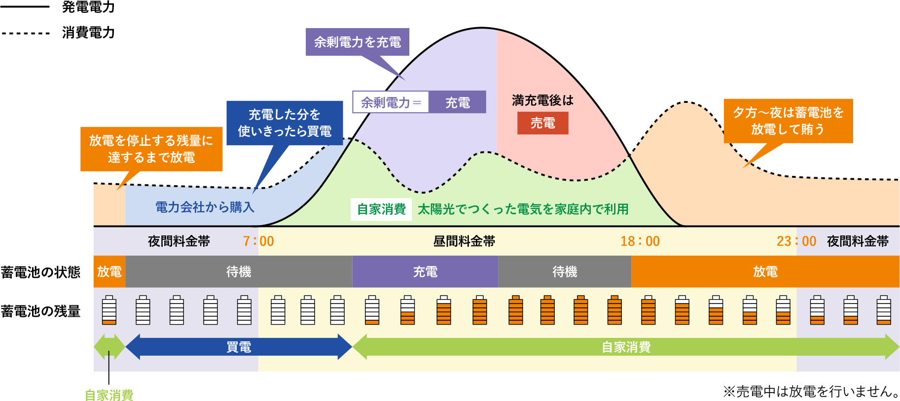 太陽光発電システム+蓄電池の生活イメージ (自家消費率を高める場合)