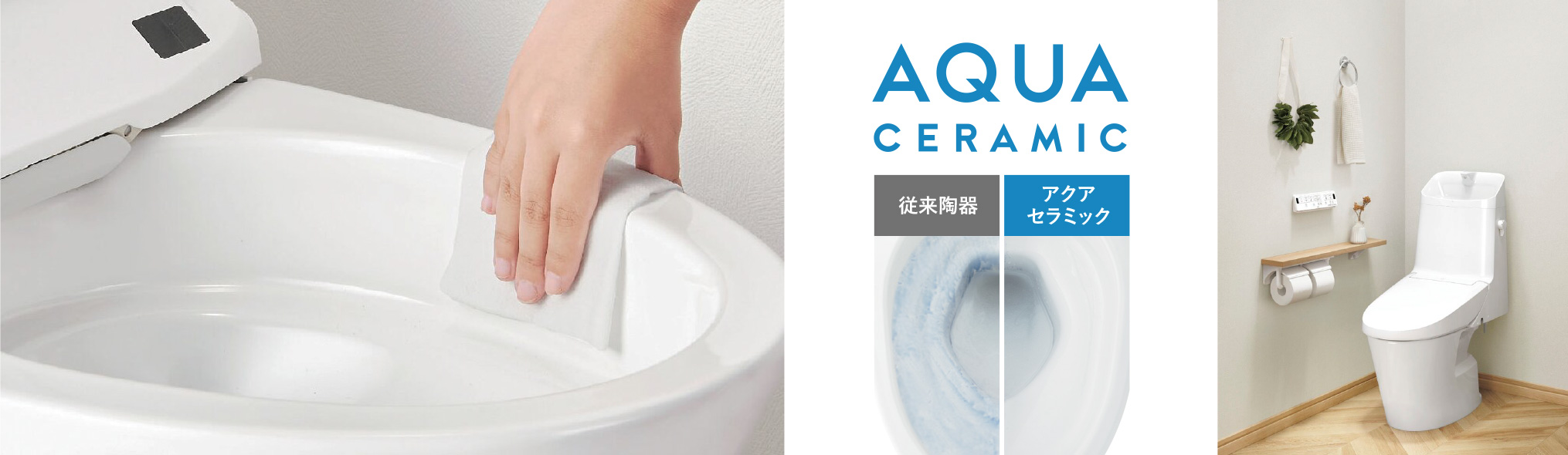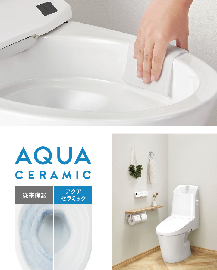 フチなし形状で掃除がしやすい便器は、アクアセラミックで水アカや汚れがつきにくく、落としやすい仕様。少ない水で使える、環境と家計にやさしいトイレです。