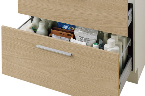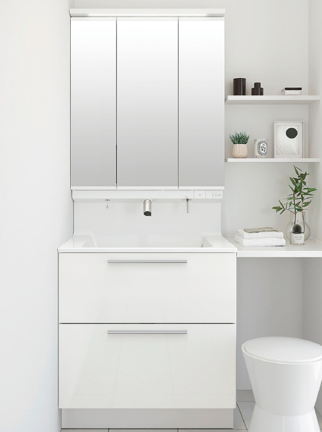 タッチレス水栓を搭載。手をかざすだけで水が出るので、メイクや歯磨きの際も清潔に使え、毎日の身支度をスムーズに。収納力と動きやすさで、暮らしに合わせた使いやすさを実現します。