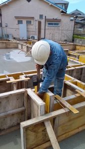 ベースのコンクリート打設完了後、立ち上がりの型枠を建て込んでいます。