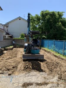 そのあとランマーで転圧、砕石敷込、また転圧して、防湿シートを敷き詰めて、捨てコンクリート打設まで完了しました。
