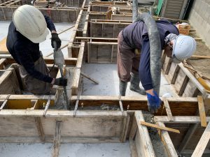 打設前にコンクリートの受け入れ検査として、スランプ試験を行い、品質の確認をした後、打設を行いました。