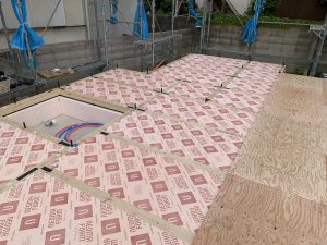 本日より大工さんによる木工事がはじまりました。 基礎が完了して、その上に大工さんで土台を敷いて、断熱材を床下に嵌め込んで行く工事を行いました。