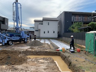 捨てコンクリ-ト(建物の位置を正確に指示する事と型枠作業をする為に必要なコンクリ-ト)を打設します。