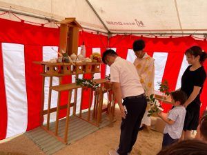 地鎮祭(じちんさい)とは、建築工事を行う際、工事が無事に終わるように神主を招いて安全祈願する儀式のことです。 その土地を守る氏神様に土地を利用させてもらう許可を得て、工事の安全を祈願するという意味で実施します。