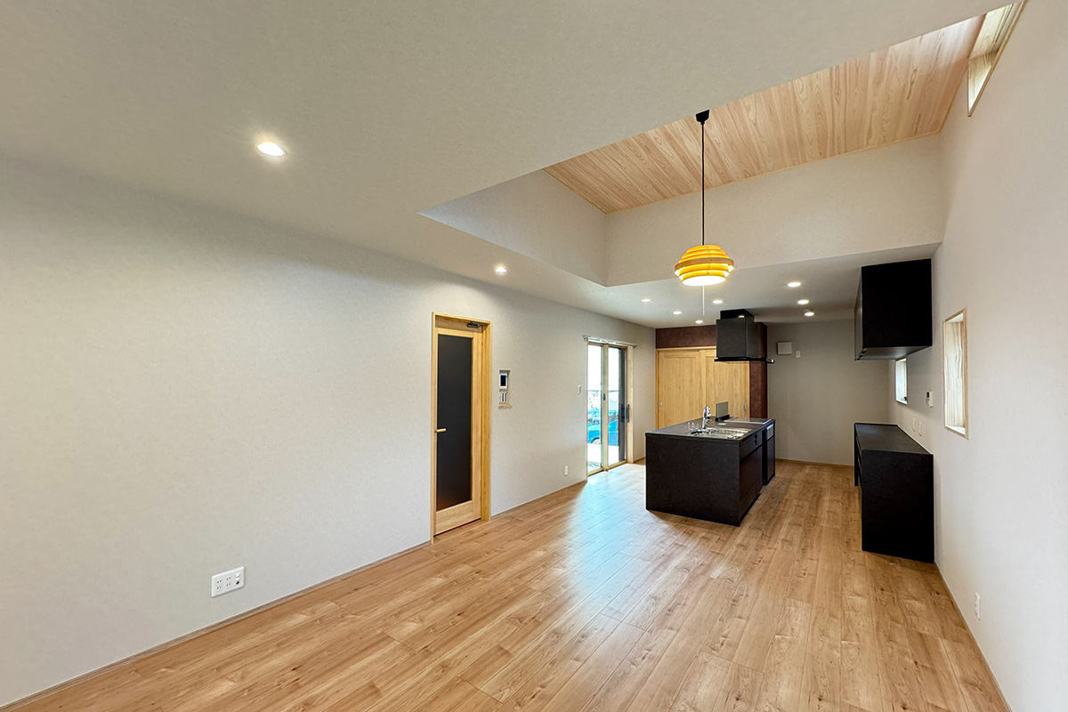 ダイニング部分を高天井にすることで、視線が縦に抜ける伸びやかなLDKを実現。