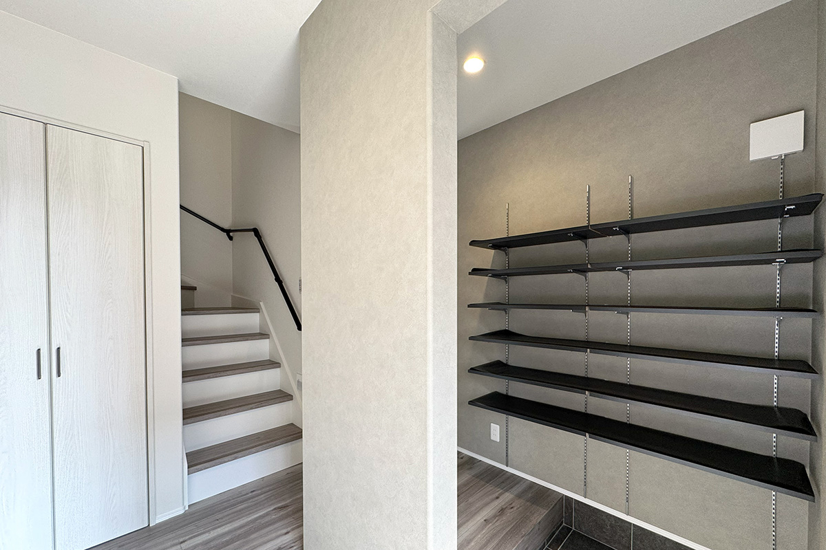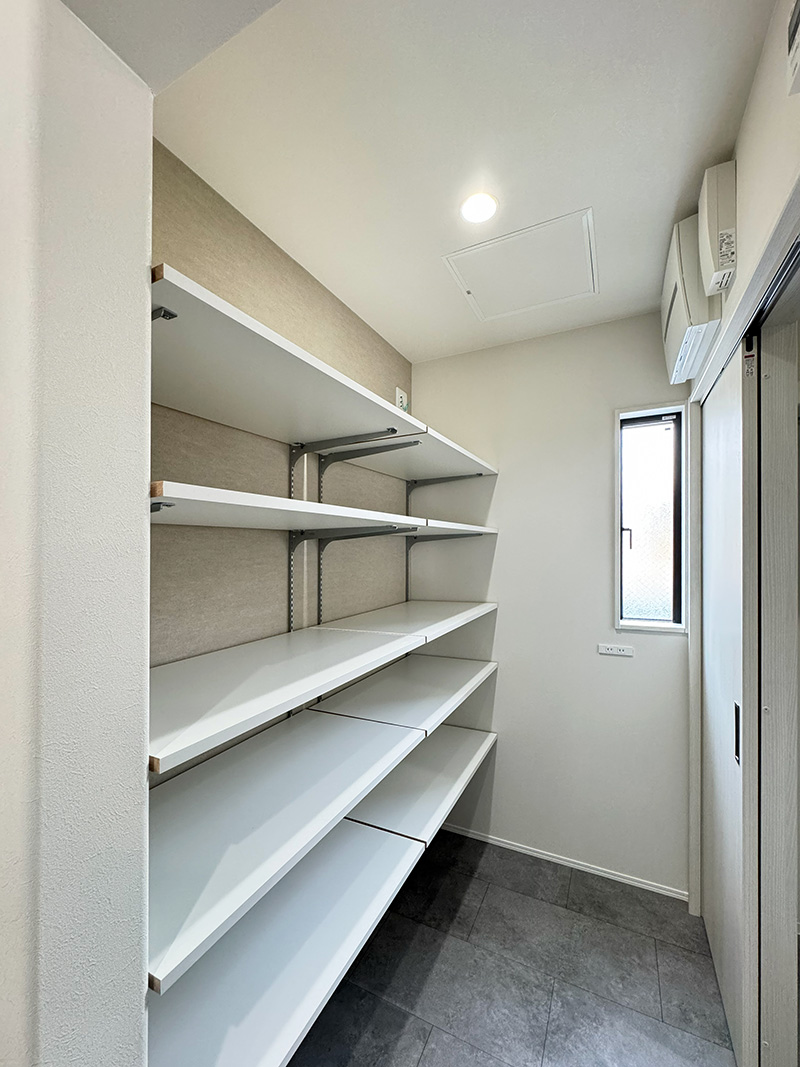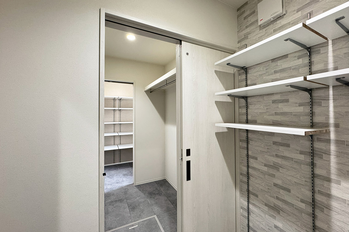 キッチン横のパントリーは可動棚仕様で自由にカスタマイズ可能。食品のストックから日用品まで一箇所にまとめて収納でき、キッチンまわりを常にすっきり保てます。