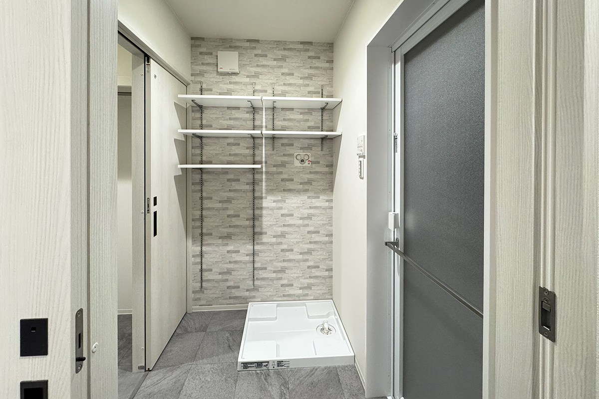 洗濯機横には脱衣カゴと棚が収まる造作収納を設計し、天井には物干しユニットを設置。洗う・干す・しまうを最短距離で完結できます。