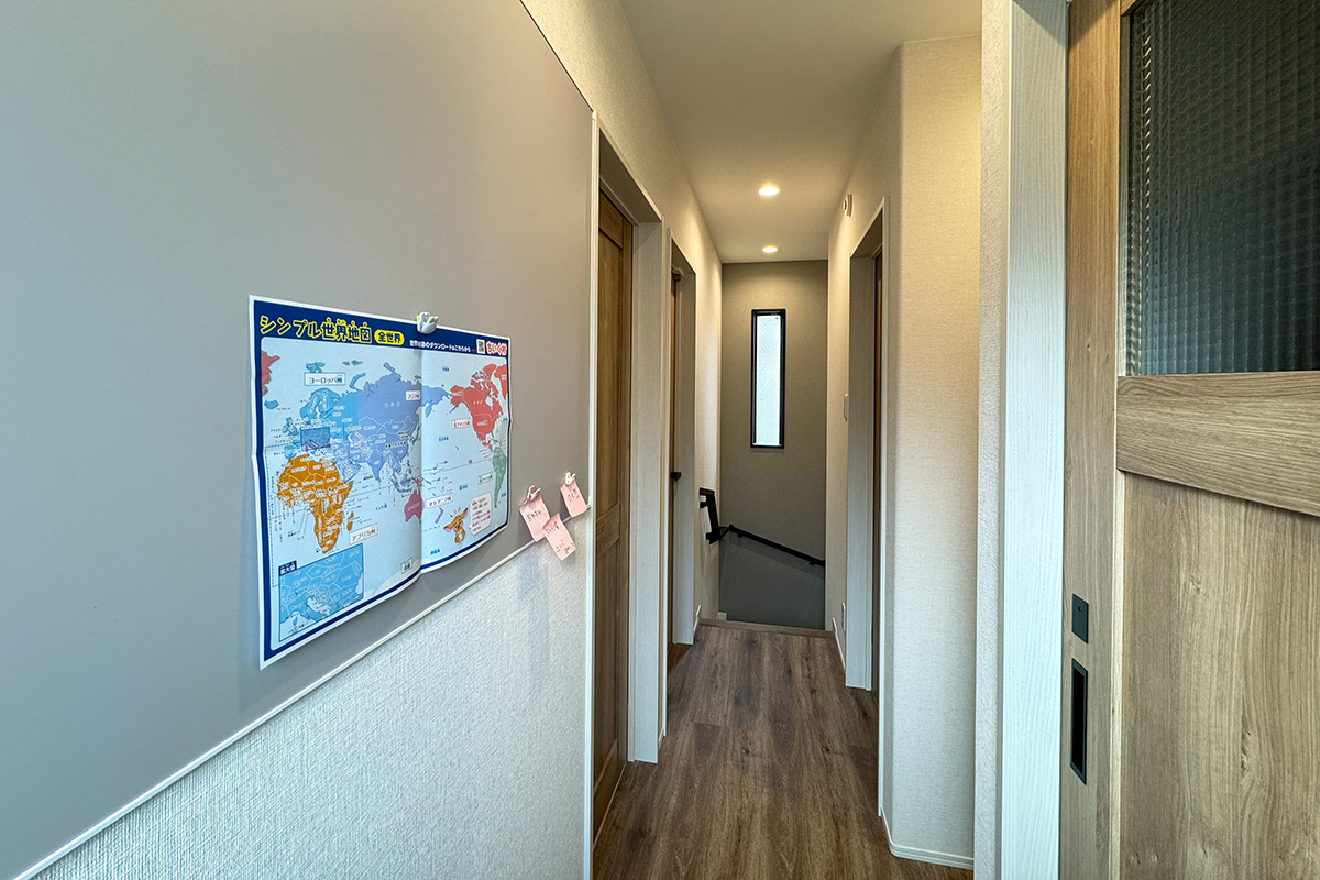 2階の洗面・トイレ前には、壁一面にマグネット対応のコミュニケーションボードを設置。