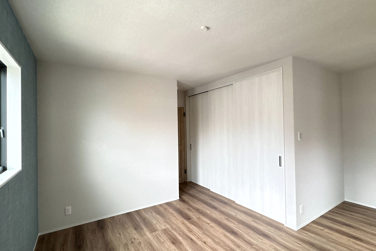 アクセントクロスが空間に程よい個性を添え、木目の床材と調和することで、上品で温かみのある雰囲気を演出。