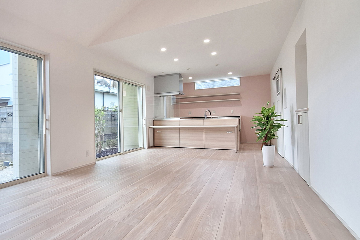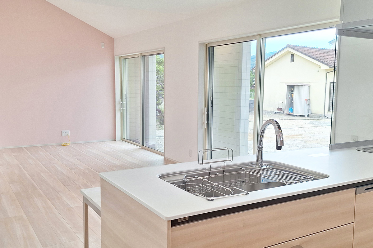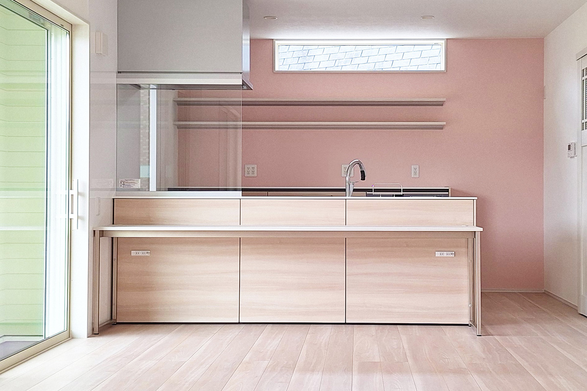 キッチンは、料理の効率性と楽しさを追求した設計です。作業スペースを広く確保し、無駄な動きを最小限に抑えるシンクとコンロの配置で、スムーズな調理の流れを実現しました。