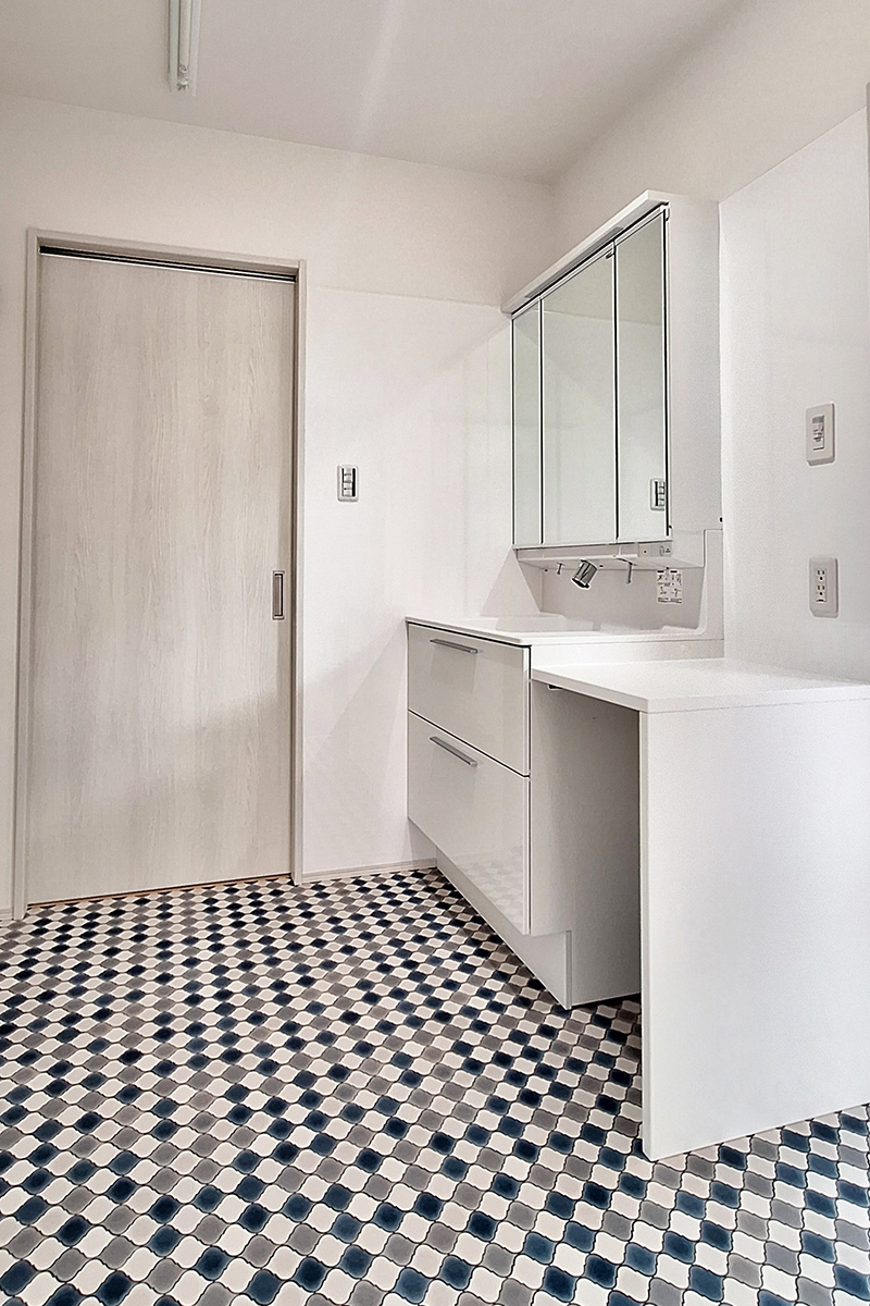 洗面所の広々としたカウンターは、複数人で同時に使用できるよう配慮した設計です。日々の生活がより快適になり、家族全員が使いやすい空間が実現しました。