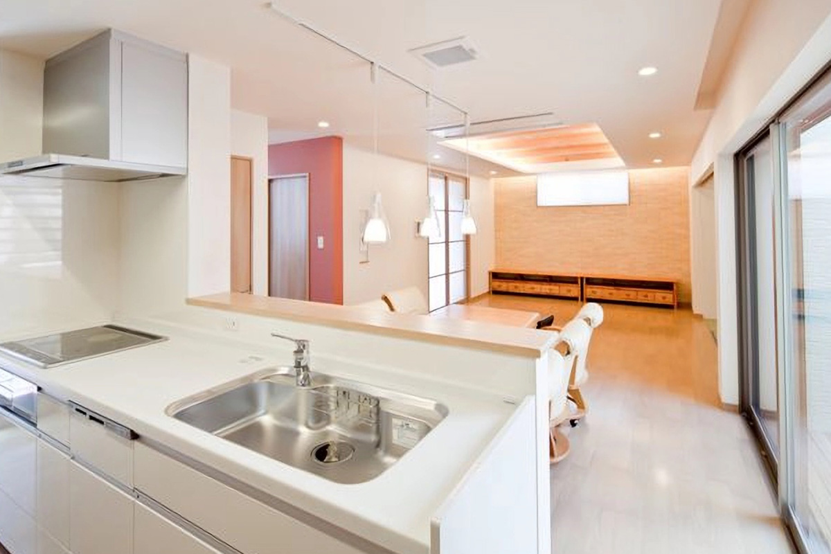 収納たっぷりのオープンキッチンからリビングにかけての開放感は最高です。