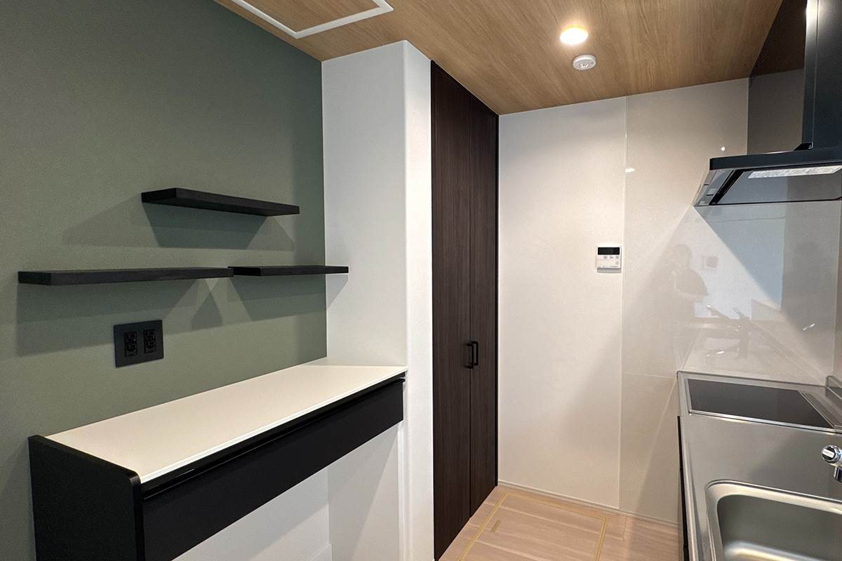部屋を見たときに自然と目が引かれる場所である、キッチンの壁にはアクセントクロスをあしらうことで、空間にメリハリを与えました。