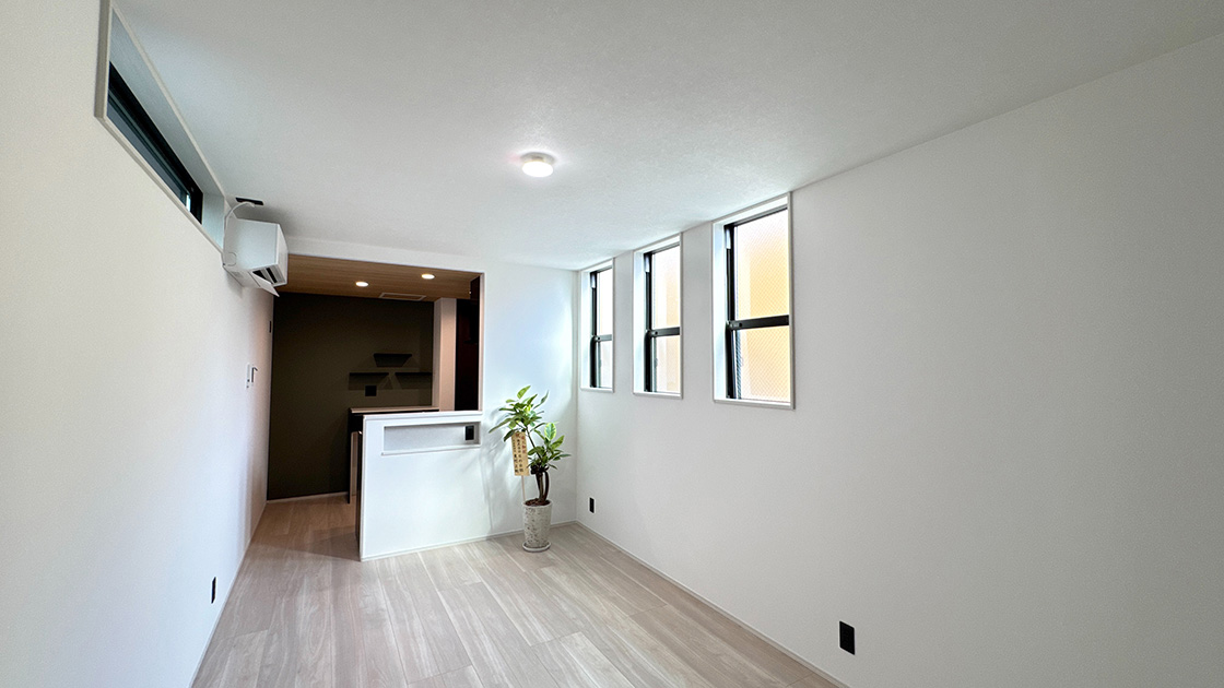 建物は9.5m×2.7mという細長い形状なので、長手方向に視線が抜けるように設計し、実際の面積以上の広がりを感じられる空間を実現しました。