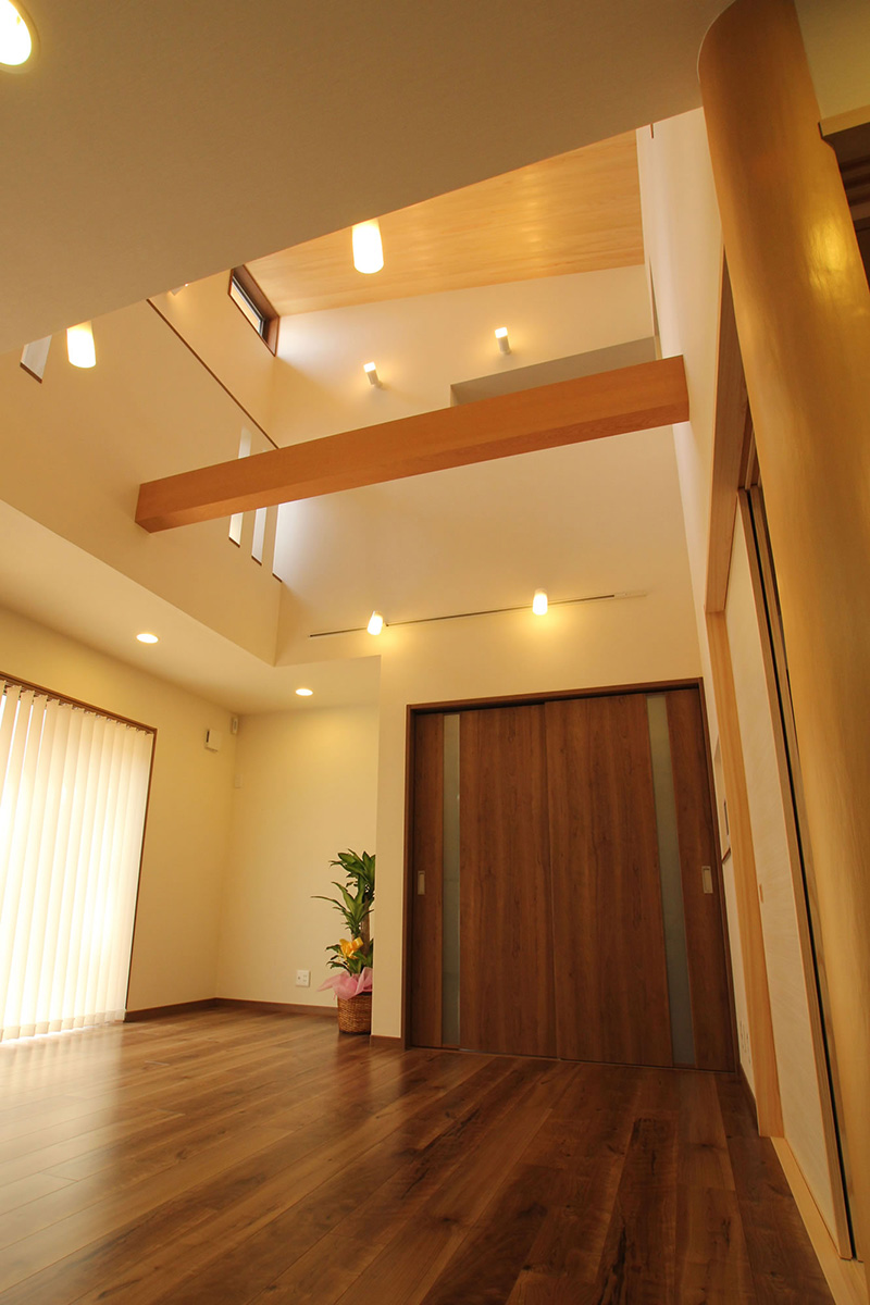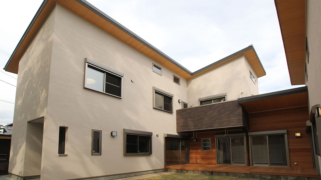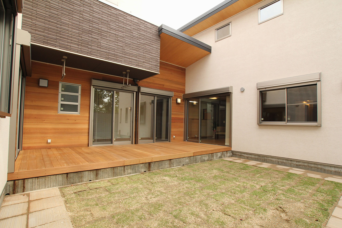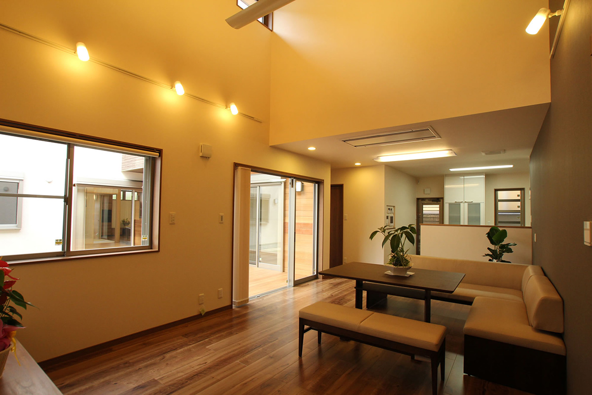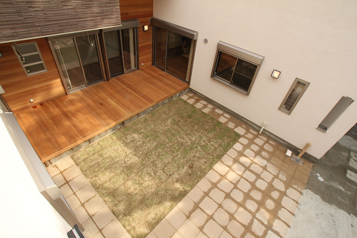 吹抜けやロフト、サンルーム、間接照明や機能性仕上げ材、中庭からのウッドデッキ、オートロックやホームセキュリティなど、たくさんの機能をとりいれながら、ご家族の個性が融合した暖かい二世帯住宅が完成しました。