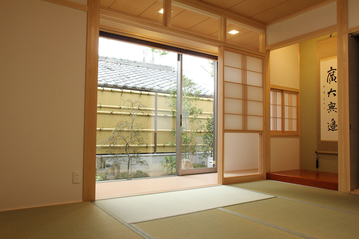 各部屋の採光通風を確保する為に、中庭を中心に南側には平屋建ての親世帯。