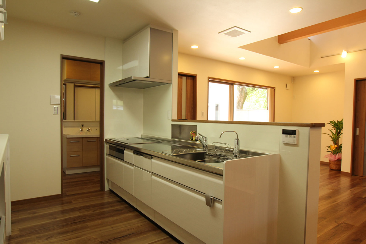 調理中も家族の様子が見え、急な来客でも生活感を抑えてすっきり保てるキッチンです。