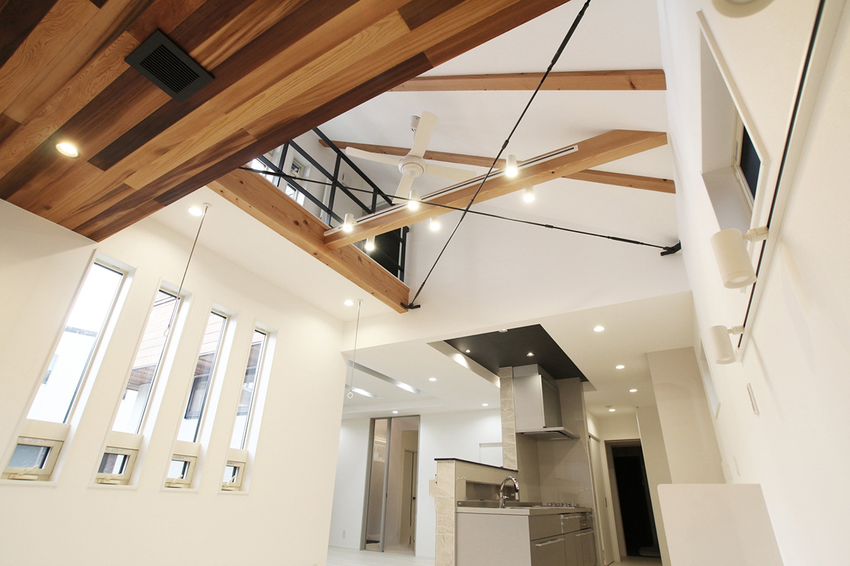 家の中心に位置する吹き抜けは、この家の象徴的な存在。